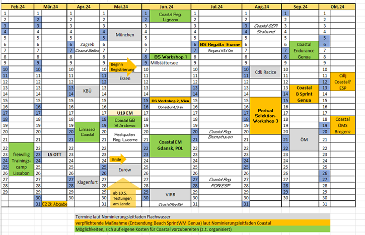 - Registrierungsphase für die Mannschaftsbildung in der Sparte Beach Sprint: Diese ist im Mai angesetzt, sodass der Fokus bis hierhin noch auf die Flachwasser-Bewerbe gewahrt bleiben kann. Die Registrierung stellt eine Anmeldung zum Kaderstatus dar.